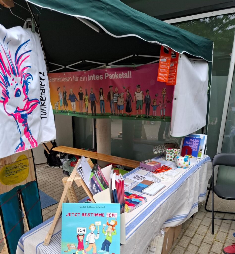 An unserem Stand haben wir mit Menschen darüber gesprochen, was sie persönlich für die Demokratie tun können oder könnten. Es kamen tolle Beispiele und Geschichten zusammen: Auch ganz normale Nachbarschaftsgeschichten von produktivem Streit und gegenseitigem Verstehen, nicht nur von Menschen, die sich direkt politisch in der Gemeinde engagieren.